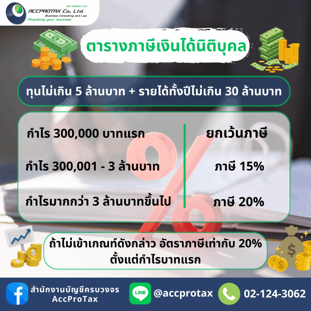 อัตราภาษีเงินได้นิติบุคคล ของบริษัทจำกัดและห้างหุ้นส่วนจำกัดในประเทศไทย มีอัตราภาษีที่แตกต่างกัน ขึ้นอยู่กับรายได้และสถานะของกิจการ ดังนี้ อัตราภาษีเงินได้นิติบุคคล “สำหรับธุรกิจทั่วไป” โดยทั่วไปแล้ว อัตราภาษีเงินได้นิติบุคคลของบริษัทจำกัดและห้างหุ้นส่วนจำกัดจะอยู่ที่ 20% ของกำไรสุทธิ อัตราภาษีเงินได้นิติบุคคล “สำหรับวิสาหกิจขนาดกลางและขนาดย่อม (SME)” เพื่อให้ธุรกิจขนาดเล็กสามารถเติบโตได้ กรมสรรพากรจึงได้กำหนดอัตราภาษีสำหรับ SME ไว้ในอัตราที่ต่ำกว่า โดยมีเงื่อนไขดังนี้: ทุนจดทะเบียนชำระแล้วไม่เกิน 5 ล้านบาท รายได้ไม่เกิน 30 ล้านบาทต่อปี หากเข้าเงื่อนไขข้างต้น จะได้รับสิทธิในการใช้อัตราภาษีแบบขั้นบันได (Progressive Tax Rate) ดังนี้: กำไรสุทธิ 0 – 300,000 บาท: ยกเว้นภาษี กำไรสุทธิ 300,001 – 3,000,000 บาท: อัตราภาษี 15% กำไรสุทธิ 3,000,001 บาท ขึ้นไป: อัตราภาษี 20% สรุปอัตราภาษีเงินได้นิติบุคคล ประเภทกิจการ กำไรสุทธิ (บาท) อัตราภาษี […]