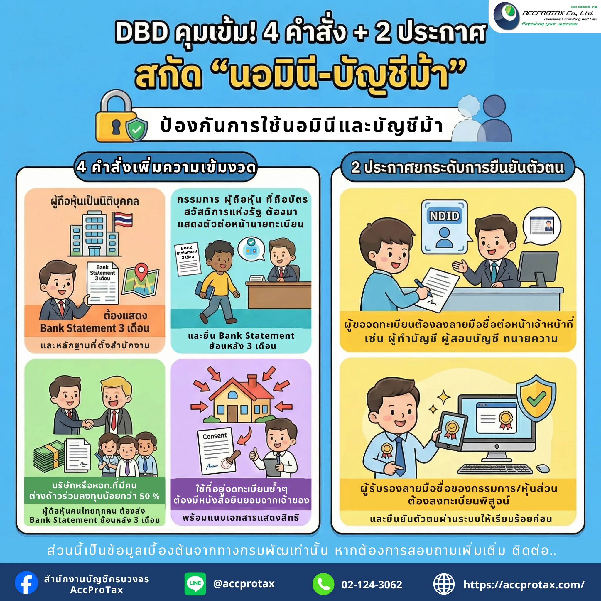 กรมพัฒนาธุรกิจการค้า (DBD) คุมเข้ม สกัดนอมินี-บัญชีม้า มากยิ่งขึ้นตั้งแต่ปี 2569 เป็นต้นไป โดยได้ออกมาตรการเข้มงวดเพื่อสกัดกั้นปัญหา “นอมินี” (Nominee) และ “บัญชีม้า” ในรูปแบบนิติบุคคลจริงค่ะ โดยล่าสุดช่วงปลายปี 2568 ถึงต้นปี 2569 ได้มีการออกคำสั่งและประกาศชุดใหม่รวม 4 ฉบับ (คำสั่งที่ 2-5/2568) เพื่อยกระดับความเข้มงวดในการจดทะเบียนจัดตั้งบริษัท ดังนี้